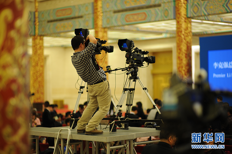 3月15日上午,國務院總理李克強在人民大會堂三樓金色大廳會見采訪十二屆全國人大五次會議的中外記者并回答記者提出的問題。圖為記者會一角的攝影記者。新華網(wǎng)/中國政府網(wǎng)?孫韜 攝?