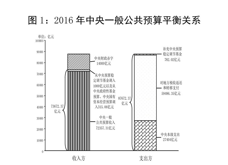 中央一般公共預(yù)算收入72357.31億元,為調(diào)整預(yù)算的100%,比2015年同口徑增長1.2%。加上從中央預(yù)算穩(wěn)定調(diào)節(jié)基金調(diào)入1000億元,從中央政府性基金預(yù)算、中央國有資本經(jīng)營預(yù)算調(diào)入315.06億元,收入總量為73672.37億元。中央一般公共預(yù)算支出86890.35億元(其中,中央本級支出27404億元,中央對地方稅收返還和轉(zhuǎn)移支付59486.35億元),完成調(diào)整預(yù)算的99.1%,增長4.5%。加上補(bǔ)充中央預(yù)算穩(wěn)定調(diào)節(jié)基金782.02億元,支出總量為87672.37億元。收支總量相抵,中央財政赤字14000億元,與預(yù)算持平。2016年中央預(yù)備費預(yù)算500億元,實際支出146.1億元,剩余353.9億元全部轉(zhuǎn)入中央預(yù)算穩(wěn)定調(diào)節(jié)基金。2016年末,中央財政國債余額120066.75億元,控制在年度預(yù)算限額125908.35億元以內(nèi);中央預(yù)算穩(wěn)定調(diào)節(jié)基金余額2678.06億元(含通過收回中央財政結(jié)轉(zhuǎn)資金補(bǔ)充1501.83億元)。