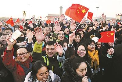 “起來,不愿做奴隸的人們……”迎著新年的第一縷晨曦,五星紅旗冉冉升起,全場高唱國歌。46秒后,國旗升至桿頂,飄揚在祖國的藍天,現場氣氛愈加熱烈,人群中爆發出如潮的掌聲、歡呼聲。