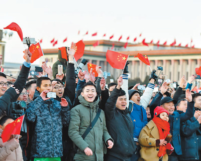 “五星紅旗迎風飄揚,勝利歌聲多么響亮……”伴隨著《歌唱祖國》的樂曲,護旗隊、禮兵依次齊步返回。數萬名群眾仍久久不愿離開,紛紛在天安門廣場拍照留念,迎接新年,向祖國送上深深的祝福。