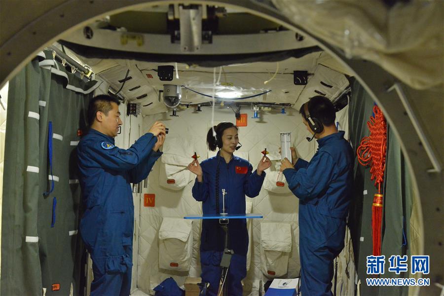 2013年5月22日,航天員王亞平(中)、聶海勝(右)、張曉光在模擬天宮一號組合體內進行太空授課訓練。新華社發(朱九通 攝)
