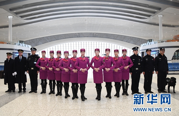 1月16日,擔任渝貴鐵路首發(fā)列車值乘工作的司機、乘務員、乘警等在重慶西站亮相。 新華社記者 王全超 攝