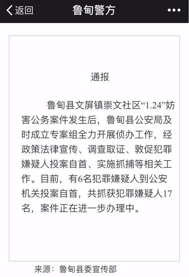 1月26日,云南昭通魯?shù)榭h委宣傳部就“不法者圍攻干警”一事通報(bào)稱(chēng),目前有6名犯罪嫌疑人已到公安機(jī)關(guān)投案自首,共抓獲犯罪嫌疑人17名,案件正在進(jìn)一步辦理中。