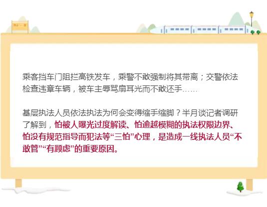 基層執(zhí)法人員依法執(zhí)法為何會(huì)變得縮手縮腳?半月談?dòng)浾哒{(diào)研了解到,怕被人曝光過(guò)度解讀、怕逾越模糊的執(zhí)法權(quán)限邊界、怕沒(méi)有規(guī)范指導(dǎo)而犯法等“三怕”心理,是造成一線(xiàn)執(zhí)法人員“不敢管”“有顧慮”的重要原因。