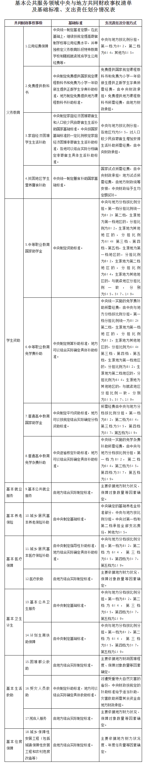 附:基本公共服務(wù)領(lǐng)域中央與地方共同財政事權(quán)清單及基礎(chǔ)標準、支出責(zé)任劃分情況表。來自中國政府網(wǎng)