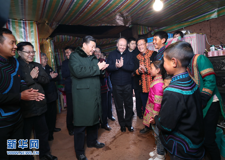 這是2月11日上午,習(xí)近平在涼山彝族自治州昭覺(jué)縣三岔河鄉(xiāng)三河村貧困戶吉好也求家中看望,聽(tīng)10歲小女孩吉好有果唱《國(guó)旗國(guó)旗真美麗》。新華社記者 鞠鵬 攝