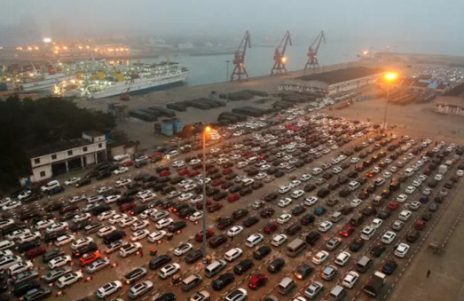 ▲ 2月22日,汽車在海口市秀英港港區(qū)內(nèi)排隊等待出島。新華社記者趙穎全攝