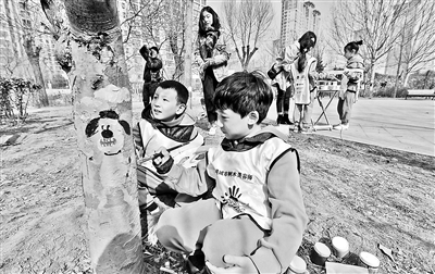 在植樹節(jié)即將到來之際,史家小學(xué)五年級(jí)4班和二年級(jí)17班的二十余名同學(xué)來到朝陽區(qū)泛海國(guó)際社區(qū)的中心花園,為這里的一棵棵小樹“穿上花衣”。