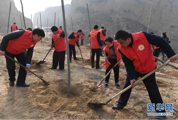 3月12日,山西省運(yùn)城市稷山縣學(xué)雷鋒志愿者協(xié)會(huì)的志愿者們?cè)诨纳骄G化點(diǎn)義務(wù)植樹。 新華社發(fā)(栗盧建 攝)