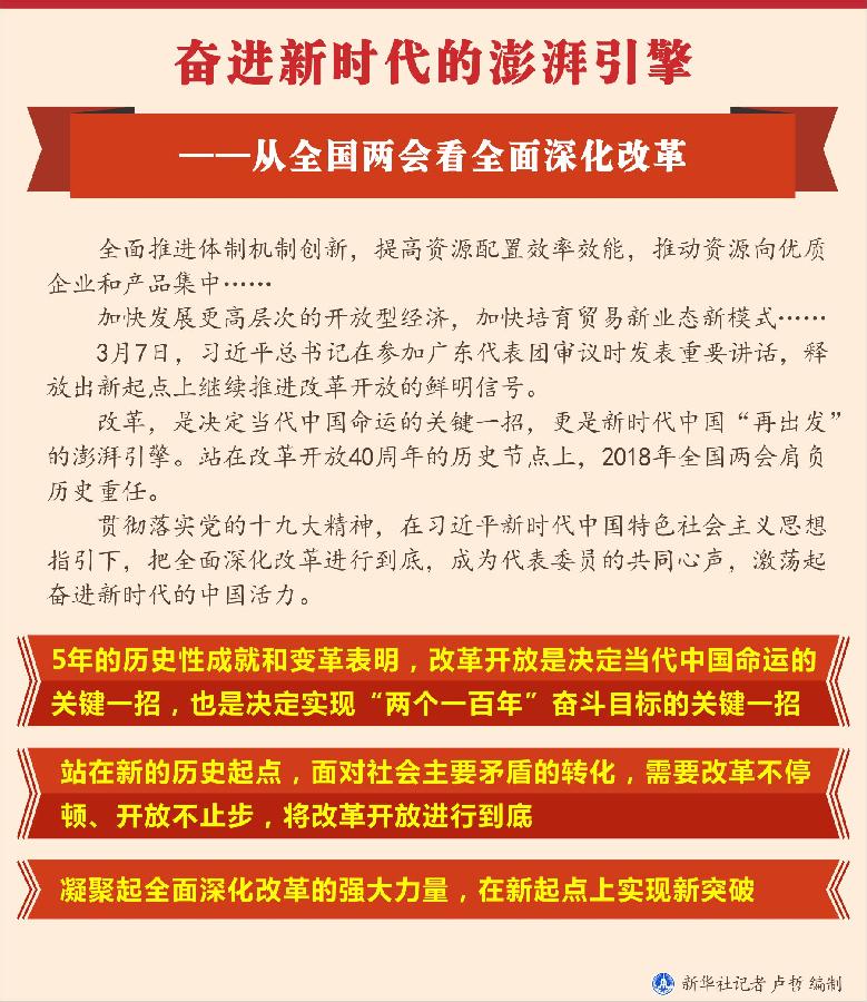 貫徹落實黨的十九大精神,在習近平新時代中國特色社會主義思想指引下,把全面深化改革進行到底,成為代表委員的共同心聲,激蕩起奮進新時代的中國活力。