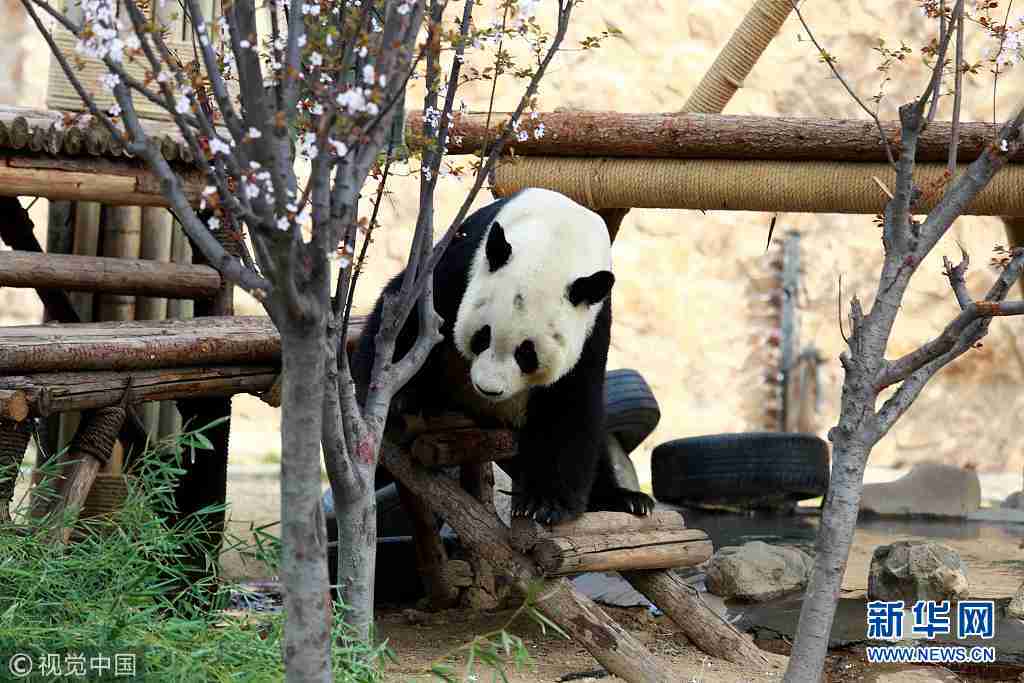 3月27日,山東濟南春暖花開,動物園內熊貓在園中散步吃美食享受春天美好陽光。(圖片來源:視覺中國)