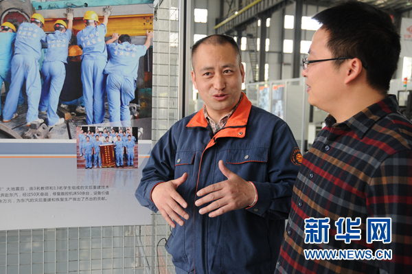 胡明華(左)與團(tuán)隊(duì)成員一起向記者回憶2008年他們?cè)鷸|汽災(zāi)后重建工作的情形。新華網(wǎng) 聶晨靜 攝