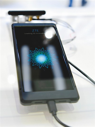 2018世界移動通信大會上,“中國智造”成為全場一大亮點。圖為大會上拍攝的中興類5G手機。新華社記者 郭求達 攝