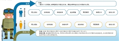 男青年應(yīng)征需經(jīng)過網(wǎng)上登記、初審初檢、體檢政審、走訪調(diào)查、預定新兵、張榜公示、批準入伍7個環(huán)節(jié)。