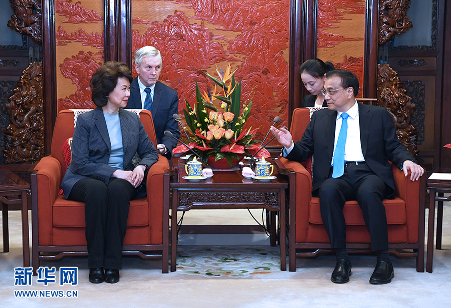 4月26日,國務(wù)院總理李克強(qiáng)在北京中南海紫光閣會見來華訪問并出席中美交通論壇第九次會議的美國運(yùn)輸部長趙小蘭。 新華社記者 饒愛民攝