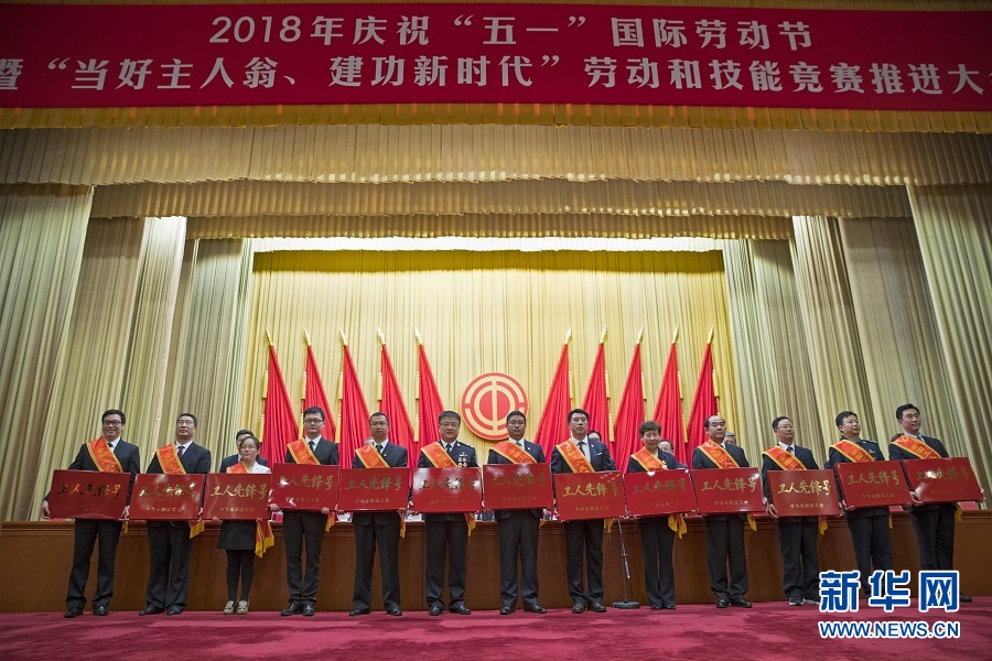 4月28日,榮獲全國工人先鋒號的部分集體代表在大會(huì)上合影。當(dāng)日,2018年慶?!拔逡弧眹H勞動(dòng)節(jié)暨“當(dāng)好主人翁、建功新時(shí)代”勞動(dòng)和技能競賽推進(jìn)大會(huì)在北京人民大會(huì)堂舉行。 新華社記者 才揚(yáng) 攝
