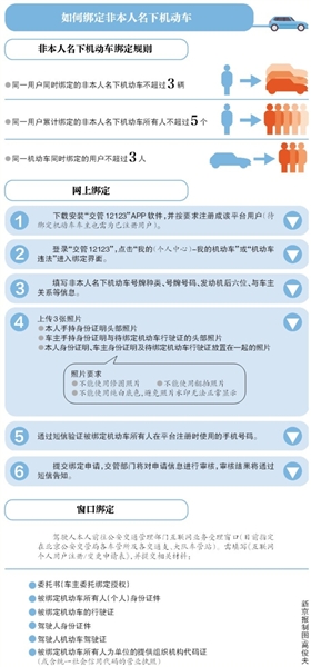 交管部門表示,目前,在線可申請綁定本人名下車輛和3輛非本人名下機動車,綁定車輛需為個人名下機動車,且必須是小型汽車或小型新能源汽車。