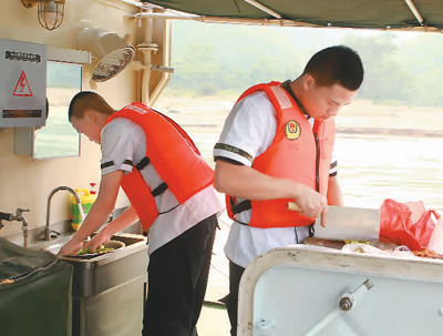 聯(lián)合巡邏執(zhí)法中,吃飯睡覺都在船艇上。做飯是由船艇上的執(zhí)法人員輪流來做。圖為53911艇上負(fù)責(zé)做飯的執(zhí)法人員在洗菜切菜。記者 張一琪 攝