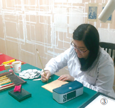 無影燈下,大大小小的毛筆、毛刷整齊排列,調色盤中墨色深淺不一,一臺小型分色測試儀隨時“待命”;桌上有根據文物原件打印出來的精細放大圖像和色彩分析數據;右手邊是帶有通風裝置的操作臺;房間盡頭處有帶過濾架的水槽,專供清洗印染后的紙張……