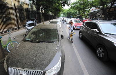 昨日,靈境胡同,機動車長時間停放車身已落滿灰塵,自行車道被占,騎車市民只能走機動車車道。新京報記者 王貴彬 攝