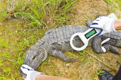 汪仁平說,2006年放歸的一條雄性揚(yáng)子鱷走出了放歸區(qū)域,跑到3公里外一個(gè)魚塘筑巢。“通過無線電發(fā)射器,這條揚(yáng)子鱷被找到了?!?/p>