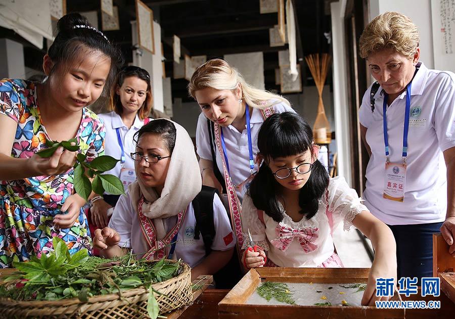 2017年8月15日,“魅力非遺——第二屆上海合作組織夏令營·非物質文化遺產交流體驗”活動在貴州省黔東南苗族侗族自治州丹寨縣萬達小鎮舉行。這是外國手工藝人在古法造紙體驗館了解花草紙的制作過程。新華社發(黃曉海 攝)
