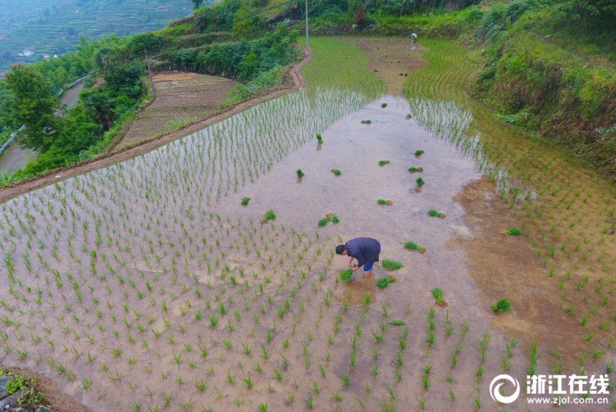 武義縣新宅鎮大萊村一農戶在梯田上手工插種單季稻。