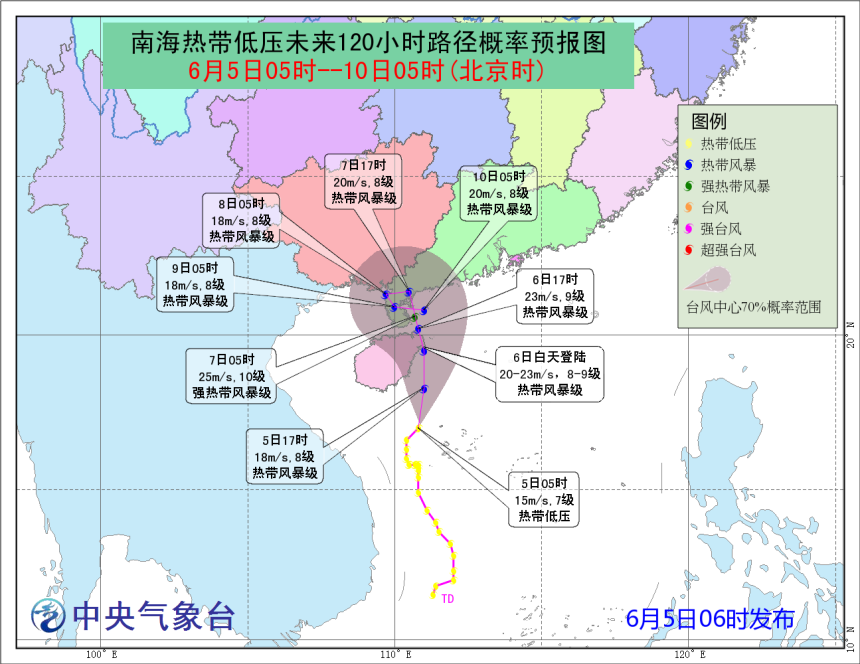 許映龍:南海的熱帶低壓于6月5日8時(shí)加強(qiáng)為今年第4號(hào)臺(tái)風(fēng)。5日16時(shí),第4號(hào)臺(tái)風(fēng)的中心位于海南省文昌市東偏南方向約85公里的海面上,中心附近最大風(fēng)力有8級(jí)(18米/秒)。目前,第4號(hào)臺(tái)風(fēng)以每小時(shí)20公里左右的速度向北偏西方向移動(dòng),并逐漸向我國(guó)海南東南部沿海靠近,并將于5日夜間至6日上午擦過(guò)或登陸海南東北部沿海(熱帶風(fēng)暴級(jí),20-23米/秒,8-9級(jí)),6日下午至7日早晨登陸廣東西部沿海(熱帶風(fēng)暴-強(qiáng)熱帶風(fēng)暴級(jí),20-25米/秒,8-10級(jí))。