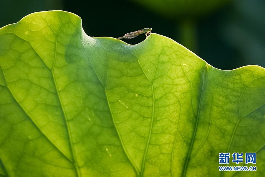 6月14日,在銅陵市西湖村荷花園內,一只豆娘在荷葉上停駐。隨著氣溫升高,安徽省銅陵市西聯鎮西湖村荷花園內的300多畝荷花絢麗綻放,吸引游客前來賞荷。 新華社記者 張端 攝
