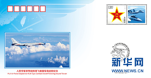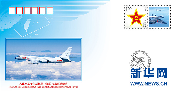這次發(fā)行的一套兩枚中英文版紀(jì)念封,是中國集郵總公司根據(jù)新華社公開播發(fā)的有關(guān)報道和新聞?wù)掌O(shè)計制作,記錄了空軍轟-6K等多型戰(zhàn)機(jī)多次繞飛祖國寶島巡航的航跡。
