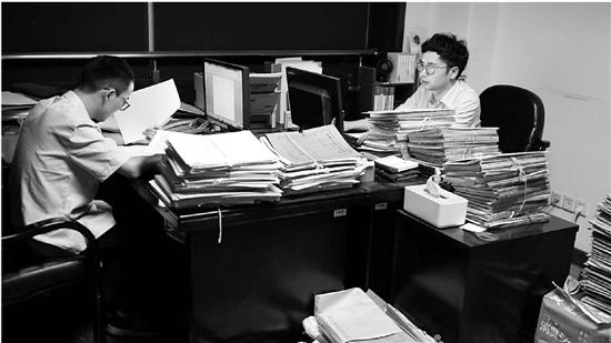晚上8點(diǎn)多的法院燈火通明,辦公室里案卷如山,案卷能夠多到什么程度?比如一件非法吸收公眾存款的案件,受害人數(shù)百上千,單單受害人筆錄有時(shí)候就是好幾推車。纖弱的書記員姑娘往往需要推著小推車輸送案卷,而法官們有時(shí)候則不得不踮著腳尖在辦公室里查閱翻看。
