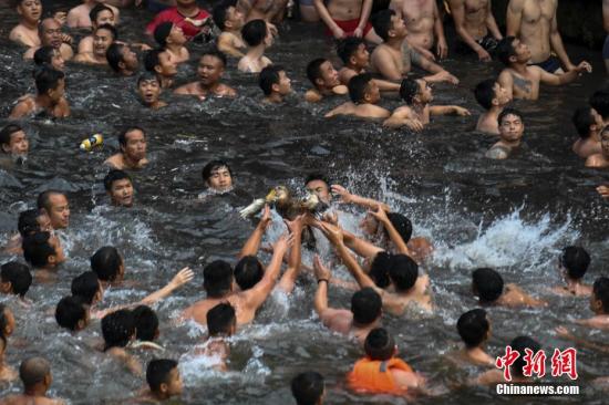 6月18日,正值端午佳節(jié),湖南鳳凰古城沱江河上一年一度的搶鴨子習俗吸引了數萬游人圍觀。楊華峰 攝