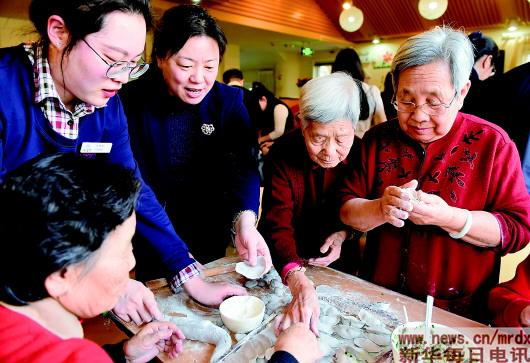 2018年春節,北京西城區金融街養老照料中心的空巢老人和護理員等一起包餃子。 圖片由受訪者提供