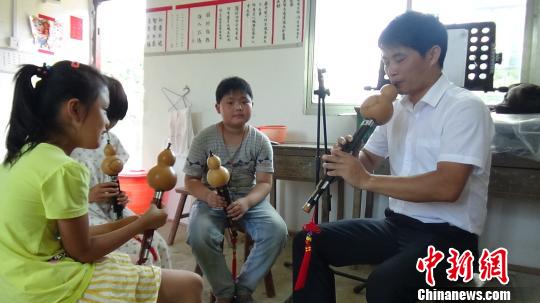 李支友教學生吹葫蘆絲。 通訊員 夏程鵬 攝