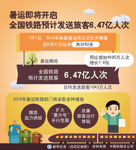 新華社北京6月29日電(記者樊曦)記者29日從中國(guó)鐵路總公司獲悉,7月1日,2018年鐵路暑運(yùn)將正式拉開(kāi)帷幕,至8月31日結(jié)束,共計(jì)62天。暑運(yùn)期間,全國(guó)鐵路預(yù)計(jì)發(fā)送旅客6.47億人次,同比增加4590萬(wàn)人次,增長(zhǎng)7.6%,日均發(fā)送旅客1043萬(wàn)人次。