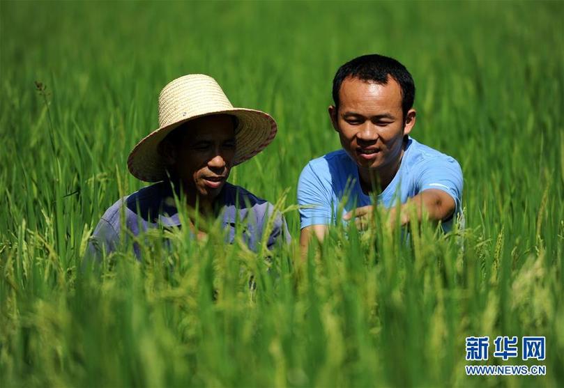 在江西永新縣三灣鄉(xiāng)三灣村田西村小組,時(shí)任村支部書(shū)記的邢鐳(右)和村民劉小林在交流紫稻生長(zhǎng)狀況(2013年8月10日攝)。新華社記者周科 攝