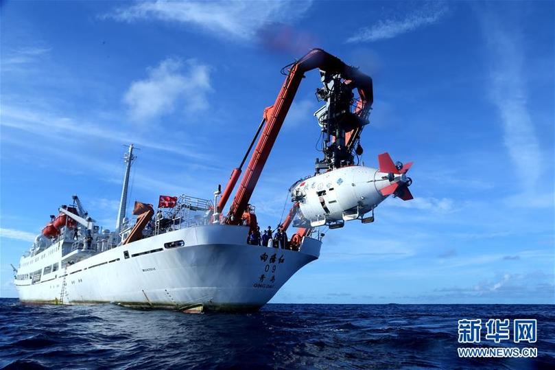 “蛟龍”號(hào)載人潛水器進(jìn)入水中,進(jìn)行中國(guó)大洋38航次最后一潛(2017年6月13日攝)。新華社記者 劉詩(shī)平 攝