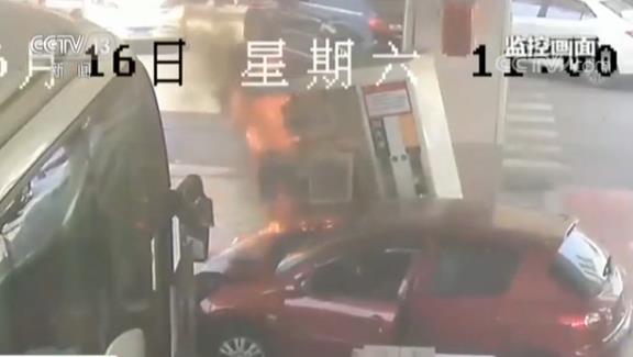 監控畫面顯示,6月16日上午11點左右,中石油長沙市岳麓大道加油站內,一輛紅色轎車突然失控撞倒加油機,隨即引發大火。