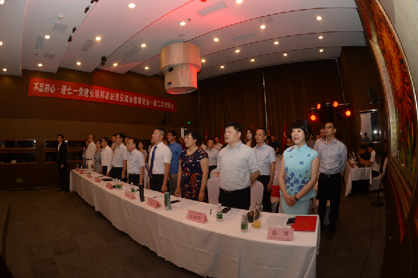 北京支持雄安產業發展促進會30日下午在京舉行“不忘初心 迎七一”黨建引領精準扶貧交流會,與會人員起立唱國歌。