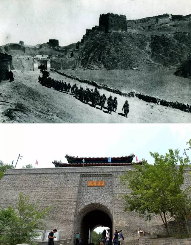 上圖為日軍進入古北口鎮城門(資料照片);下圖為2017年6月21日拍攝的古北口鎮城門(新華社記者 王化娟 攝)。
