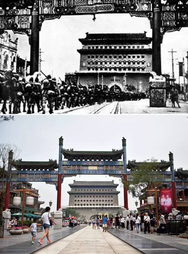 上圖為1937年7月29日,日軍侵入正陽門(資料照片);下圖為2017年7月3日拍攝的正陽門(新華社記者 張晨霖 攝)。