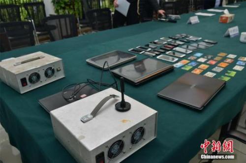 資料圖:廣東省公安廳內展示的涉電信詐騙犯罪案中的作案工具。中新社發 陳驥旻 攝