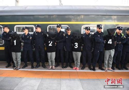 2017年8月29日,長春火車站,10名電信詐騙犯罪嫌疑人被長春警方從國外經云南押解回國。中新社記者 張瑤 攝