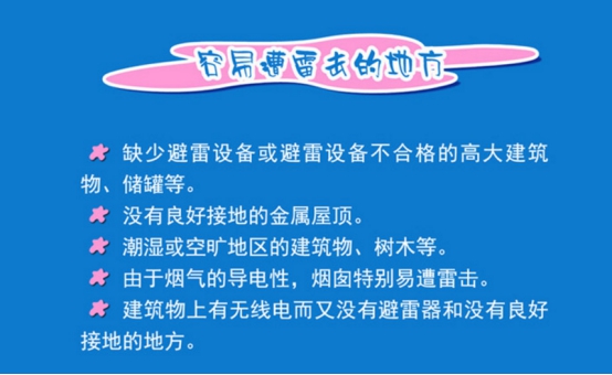 據統計,雷擊地點發生在農田的比例最高(32%),其次是建構筑物(23%,主要是農村民居、窩棚、亭子),第三是開闊地、水域(河邊、沙灘)和樹下。