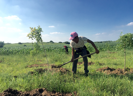 一路上,看到有幾十個村民在林地里忙碌著植樹。先是用鐵鍬在土地里刨坑,然后把帶有土壤的樟子松或五角楓樹放在刨好的坑里栽上。在長時間強烈的日照下,盡管他們戴著太陽帽,或穿戴嚴實、裹著頭巾,皮膚照樣曬得黝黑。村民告訴記者,因為不用去外地打工,可以在自己家的地盤上種樹,有收入,雖然苦點,還是很幸福的。