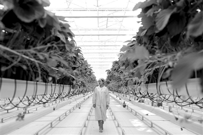 創(chuàng)新發(fā)展不僅停留在工業(yè)層面,2016年9月,海升集團投資建設(shè)的5萬平方米現(xiàn)代智能玻璃溫室草莓栽培項目“草莓星球”正式投入使用。項目采用智能升降溫管理系統(tǒng)、精準水肥循環(huán)系統(tǒng)和基質(zhì)吊架立體栽培等來自荷蘭的工業(yè)化現(xiàn)代農(nóng)業(yè)生產(chǎn)技術(shù),實現(xiàn)了溫、光、氣、水、肥的智能精準控制,草莓實現(xiàn)了一年9個月產(chǎn)果,產(chǎn)量較以往提升了3倍以上。