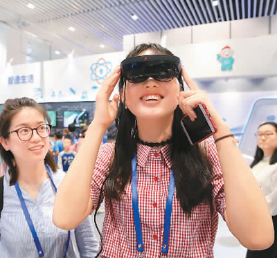5月19日,參觀者在北京科技周上體驗國際上首款量產版全高清AR智能眼鏡。陳曉根攝(人民視覺)
