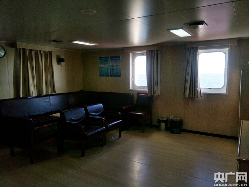 餐廳對面是船員休息區(qū),裝有衛(wèi)星電視。以前出海就相當于與外界隔絕。而現(xiàn)在,打開船上的電視,每天都能看到十幾個頻道的電視節(jié)目。茫茫大海上,雖遠離陸地,卻時時刻刻都可以看到國內(nèi)最新動態(tài),信息無盲區(qū)。