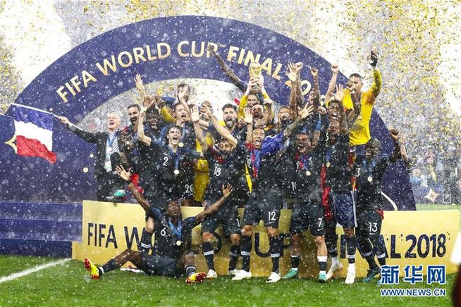 圖為2018年7月15日,在莫斯科進(jìn)行的2018俄羅斯世界杯足球賽決賽中,法國(guó)隊(duì)球員在頒獎(jiǎng)儀式上慶祝。法國(guó)隊(duì)以4比2戰(zhàn)勝克羅地亞隊(duì),繼1998年后再奪世界杯冠軍。新華社記者曹燦 攝