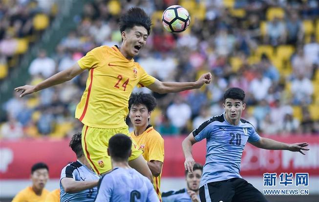 圖為2018年5月27日,在四川成都舉行的2018“熊貓杯”國(guó)際青年足球錦標(biāo)賽中國(guó)U19國(guó)家青年隊(duì)對(duì)陣烏拉圭U19國(guó)家青年隊(duì)的比賽中,中國(guó)隊(duì)球員蔣圣龍(上)在比賽中爭(zhēng)頂。最終,中國(guó)U19國(guó)家青年隊(duì)以3比1戰(zhàn)勝烏拉圭U19國(guó)家青年隊(duì)。新華社記者薛玉斌 攝